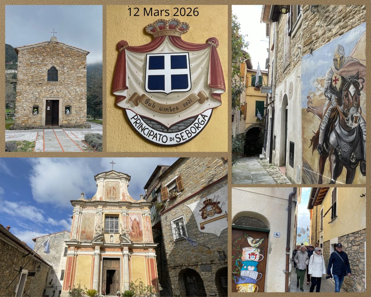 Nous avons retrouvé Patrice notre guide à Nice, avant d’arriver à la frontière italienne, celui-ci nous a retracé l’évolution de Menton et Monaco. C’est par une route sinueuse bordée de mimosas et de genêts blancs que nous avons atteint Seborga.